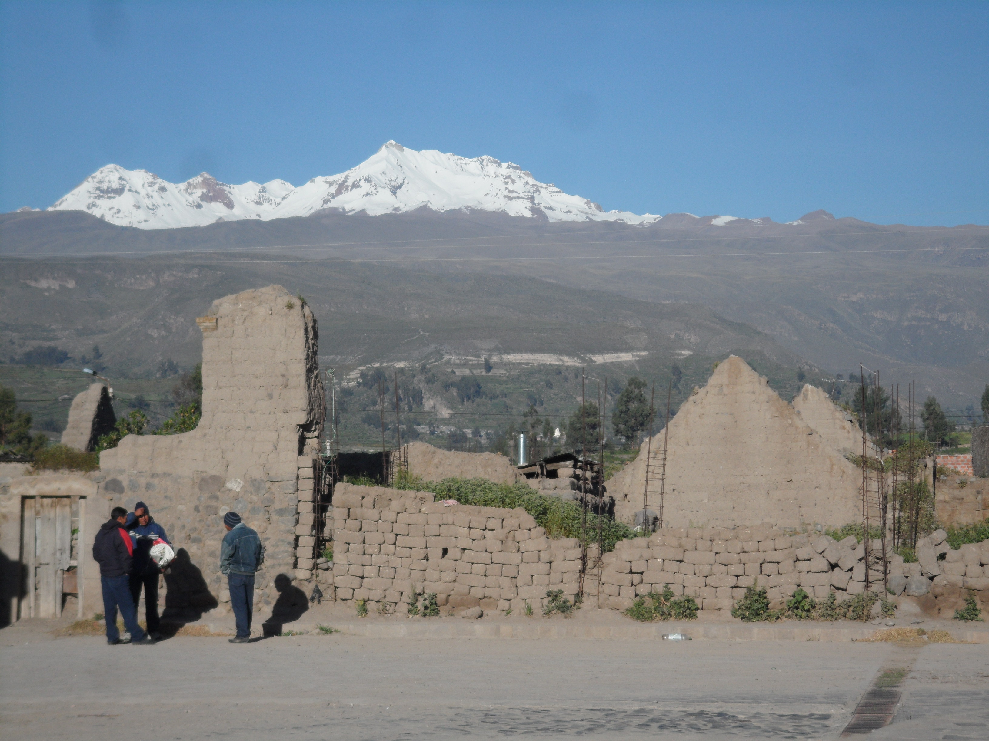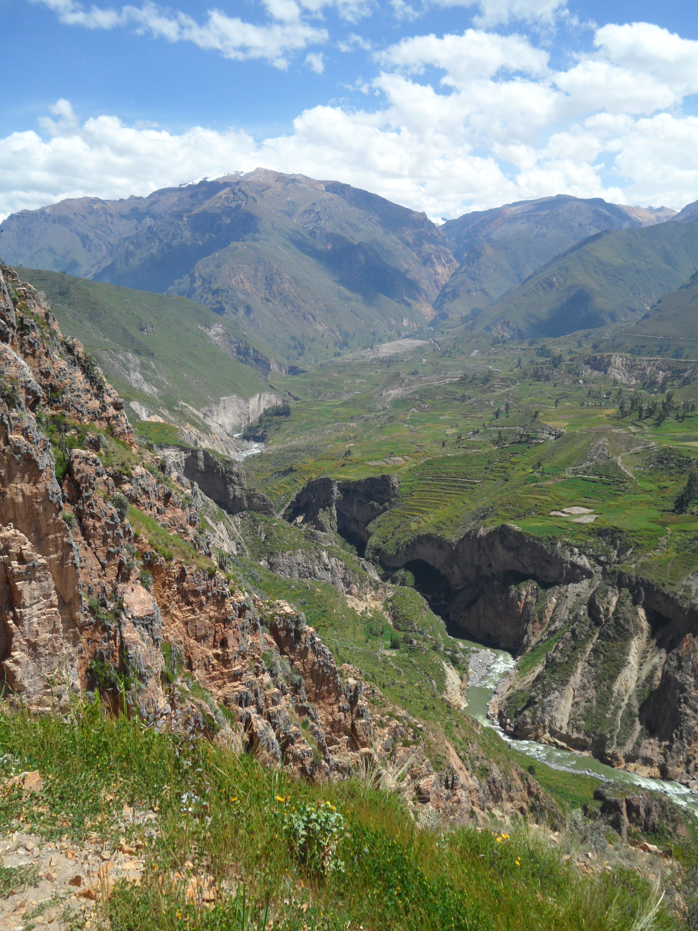 From breakfast we went further into the valley towards the small town of Chivay. The valley was beautiful in the morning sunlight. The place was so green, with thousands of man made, grass terraces stretching for kilometers down the mountainside towards the river at the base of the canyon. The taller mountains were snowcapped, and it was our first glimpse of snow in South America.