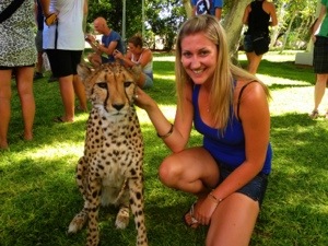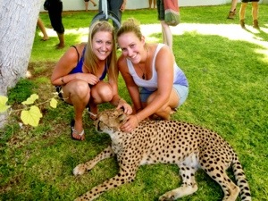 At 4:00 it was time to see the cheetahs. Cheetah park actually has 4 cheetahs that are tame enough to play with. You can touch them, play tug of war, cuddle them, whatever you’d like! We were overly enthusiastic (as we are about most everything here) about petting the cheetahs. Gina especially had been waiting for this day since Vic Falls, and it was finally upon us.