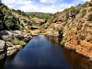 Kelsi and I grabbed our things and climbed down into the gully. What a spot! We lay out on the rocks with some music and soaked up the sun. Then it was swimming time. I climbed down the rocks to see how deep the pool was, and Kelsi swung off the flying fox. We swam around for a while, then tried to climb up the rocks on the far side of the pool.