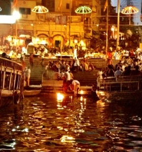 From there we watched the nightly ceremony. Rows of men stand in a line to perform the ritual for the dead. They are all lit up in golden lights and surrounded by a fiery glow. The beating of drums and bells echoes across the river and children hand out small candles to all the spectators below. The candle is surrounded by flowers and, once lit, is placed in the river to float away. If your candle floats a long way, it means you will have a long life. Both Kelsi and my candles went far, although Kelsi’s had a near escape with a boat oar on the way (sounds like Kelsi’s life). The river was beautiful when it was all lit up with floating candles and crammed full of row boats. I have to admit though, the ceremony was just too long. They performed the same dance over and over again with different object in their hands. What at first was awe-inspiring to see, soon became just an uncomfortable boat bench and a crowd of people. After 2 and a half hours, our boat began to slowly sink and so we cruised back to the shore to go home. We walked the ghats to see the final cleanup of the ceremony before grabbing dinner in old town and heading home.