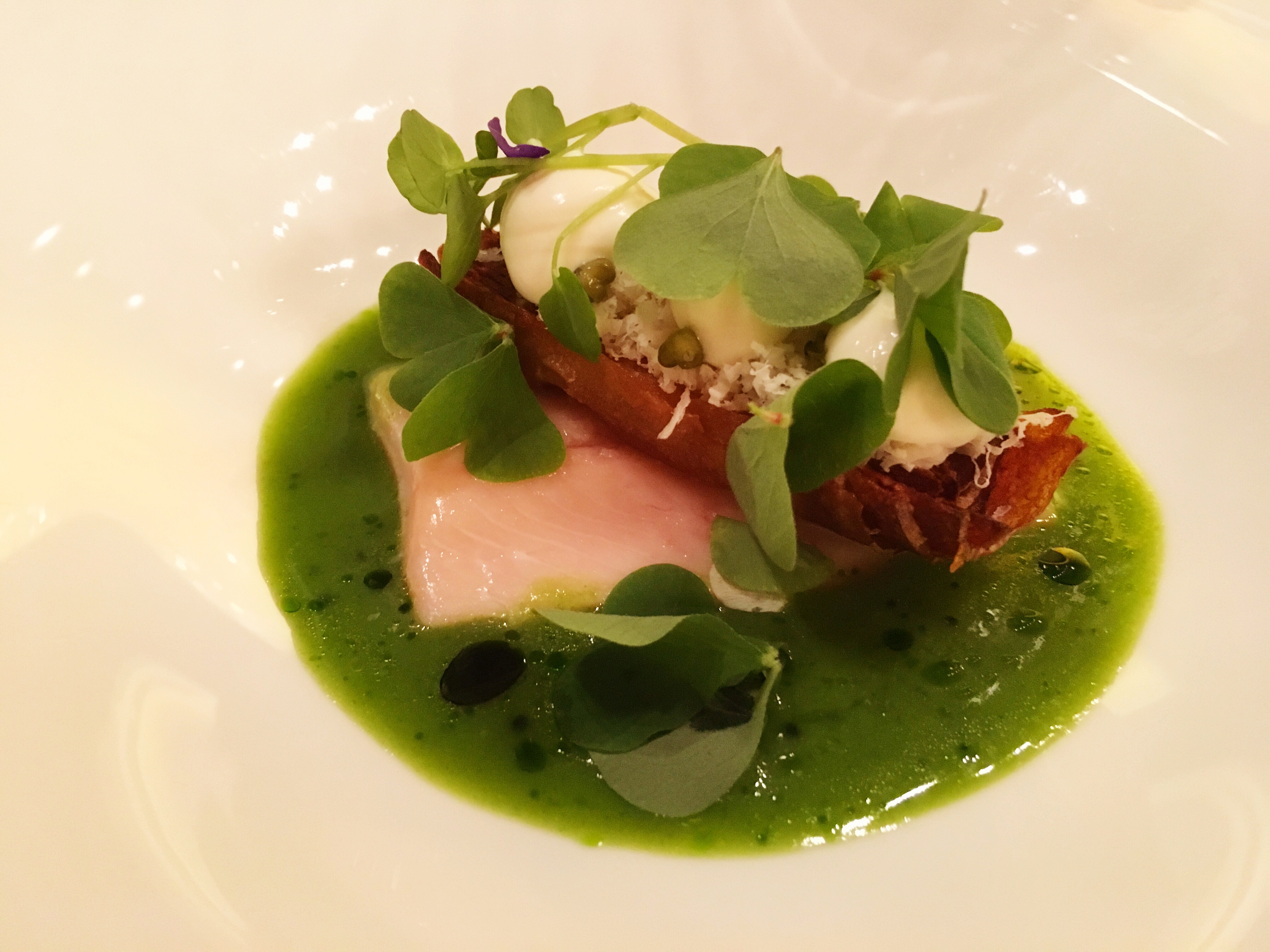 By the time our first course came, with it’s proper wine pairing of course, we were already half full. A decadent looking asparagus salad with chervil and elderflower was placed in front of us. Two waiters worked as a team to describe the dish.