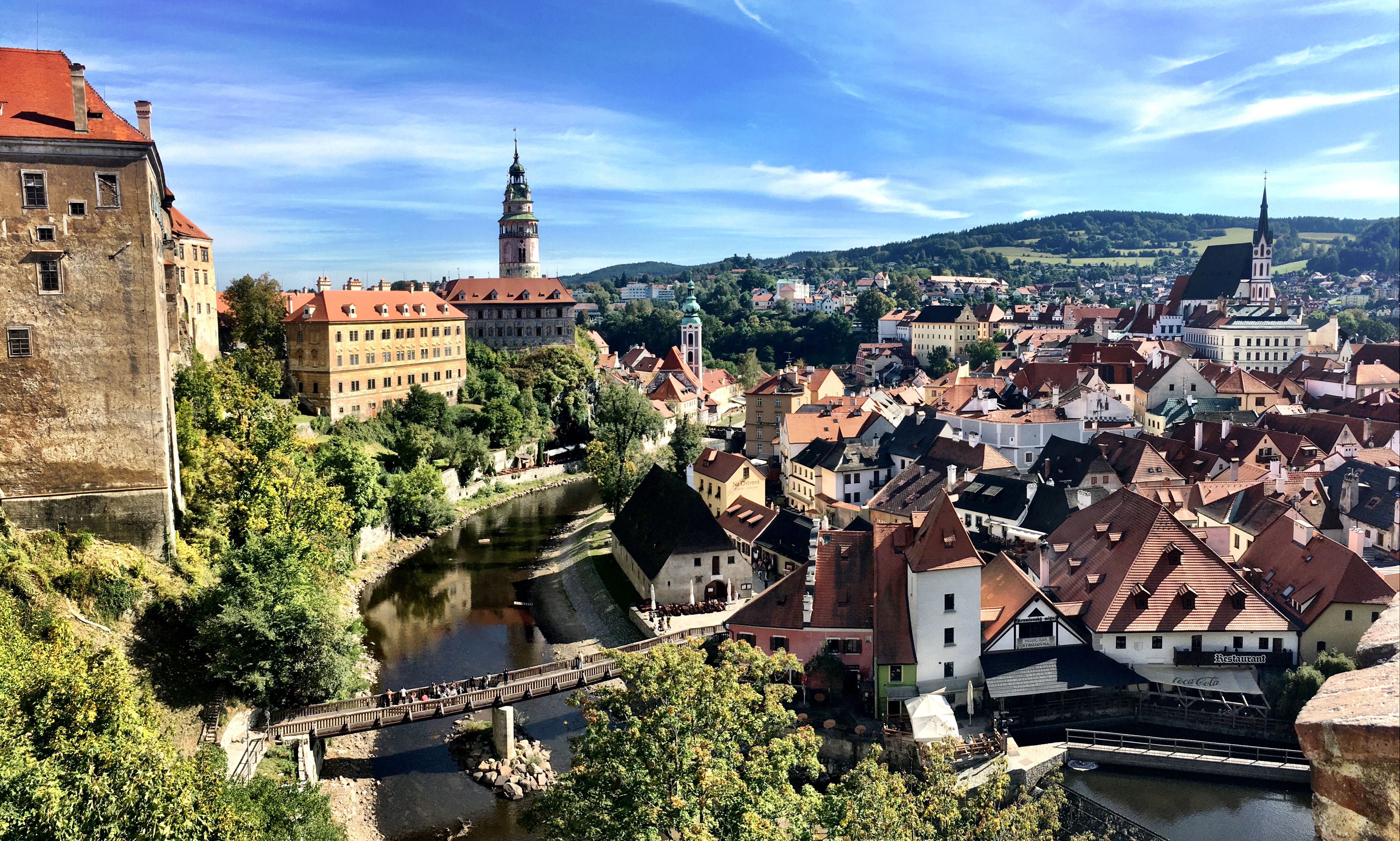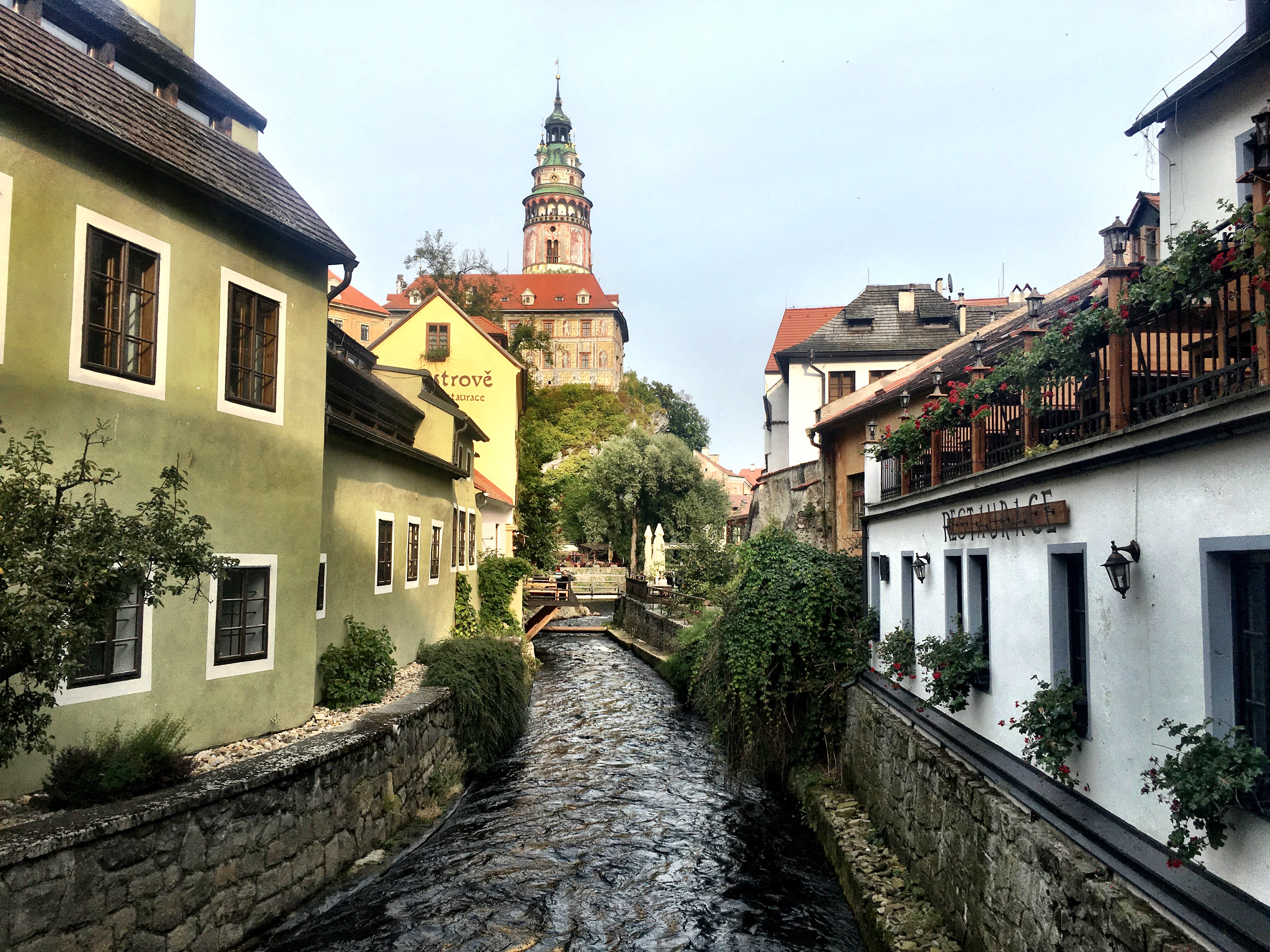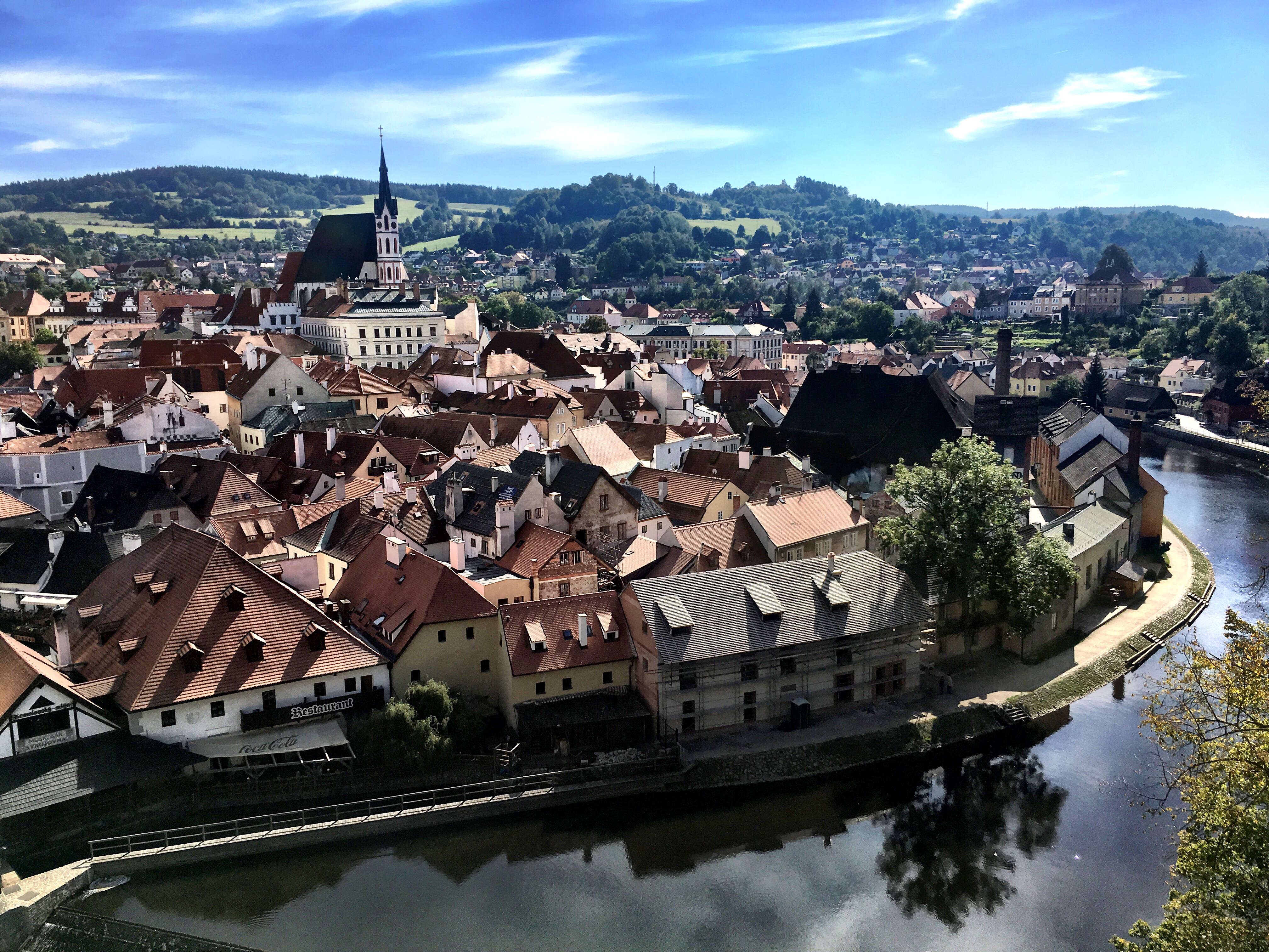 Krumlov is a Czech word that means “Meander”. The town was named after the river that “meander’s” it’s way through the city in a big “S” shaped loop. A large, baroque castle is built into the rock face on the North side of the river. From there, the entirety of Cesky Krumlov can be seen below. The flowing river, the green hills in the distance, and the whole town all squeezing into the space between your thumb and forefinger.