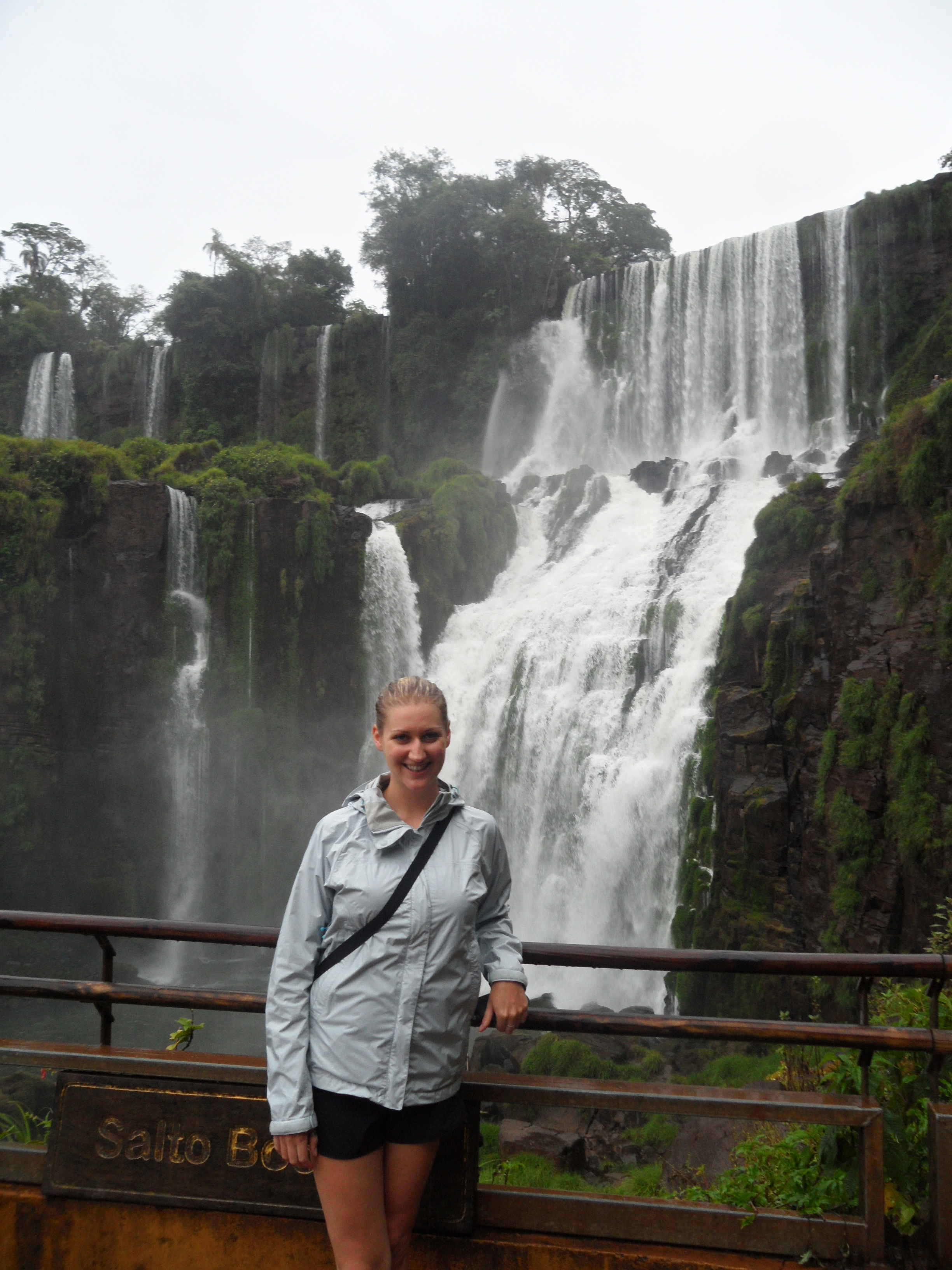 The next morning we were pumped up for the falls! I woke up, showered (carefully, since it appears ALL the showers this far north are suicide showers) and headed outside to breakfast… As I got outside, I realized it was not just raining, but pouring down in a torrential monsoon only possible in tropical rainforests. Thunder boomed and the heavy-duty waterspouts on our building were having trouble holding in all the rain. However, the weather was not about to deter either of us from enjoying this wonder of the world, so we grabbed our raincoats and headed for the bus stop!