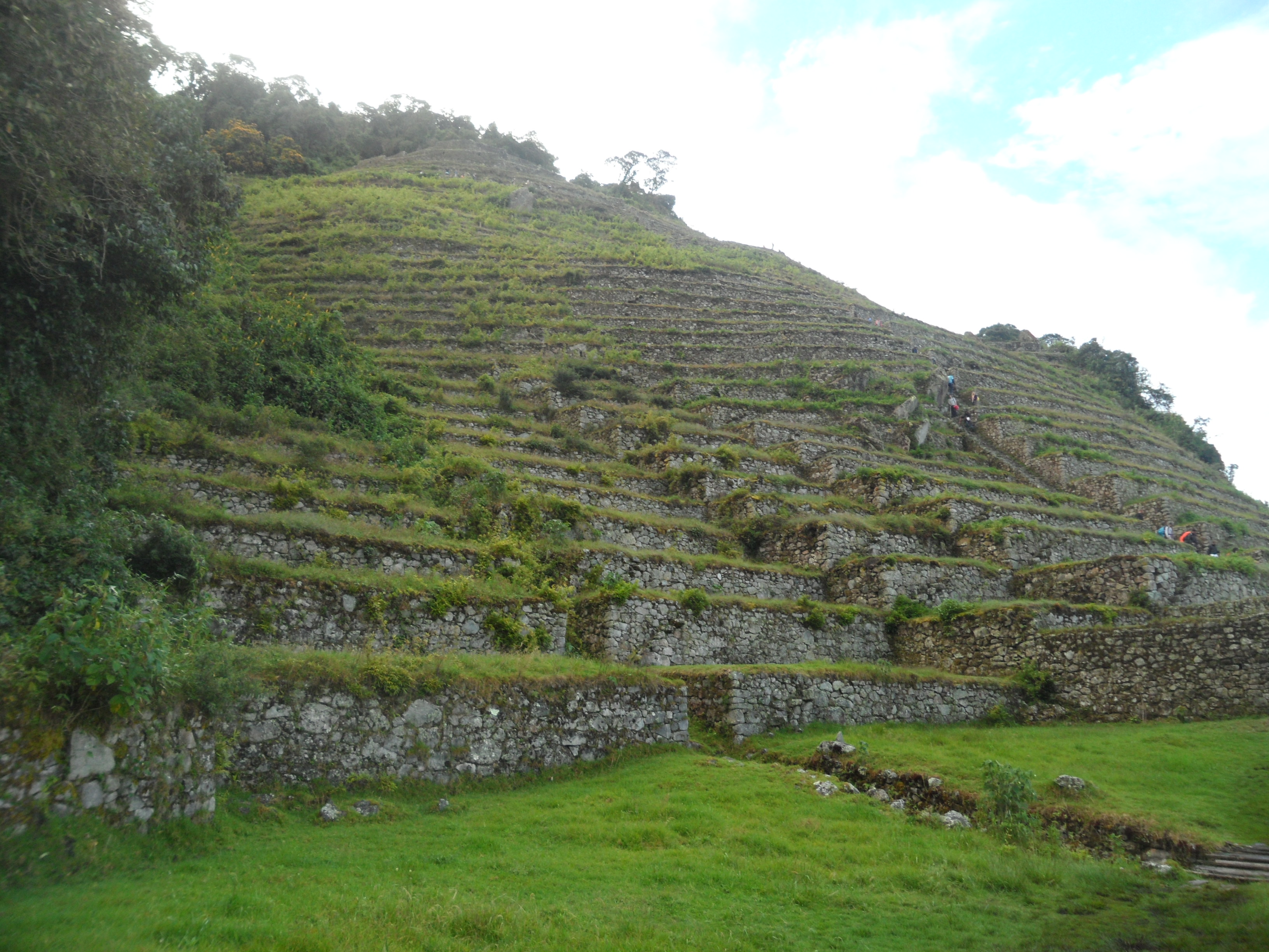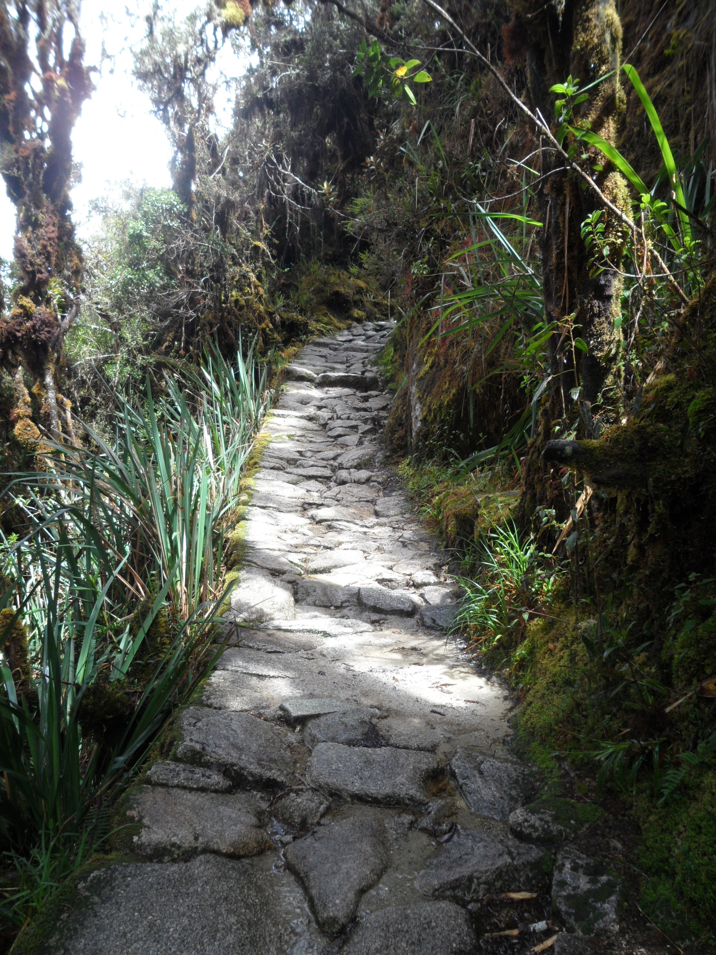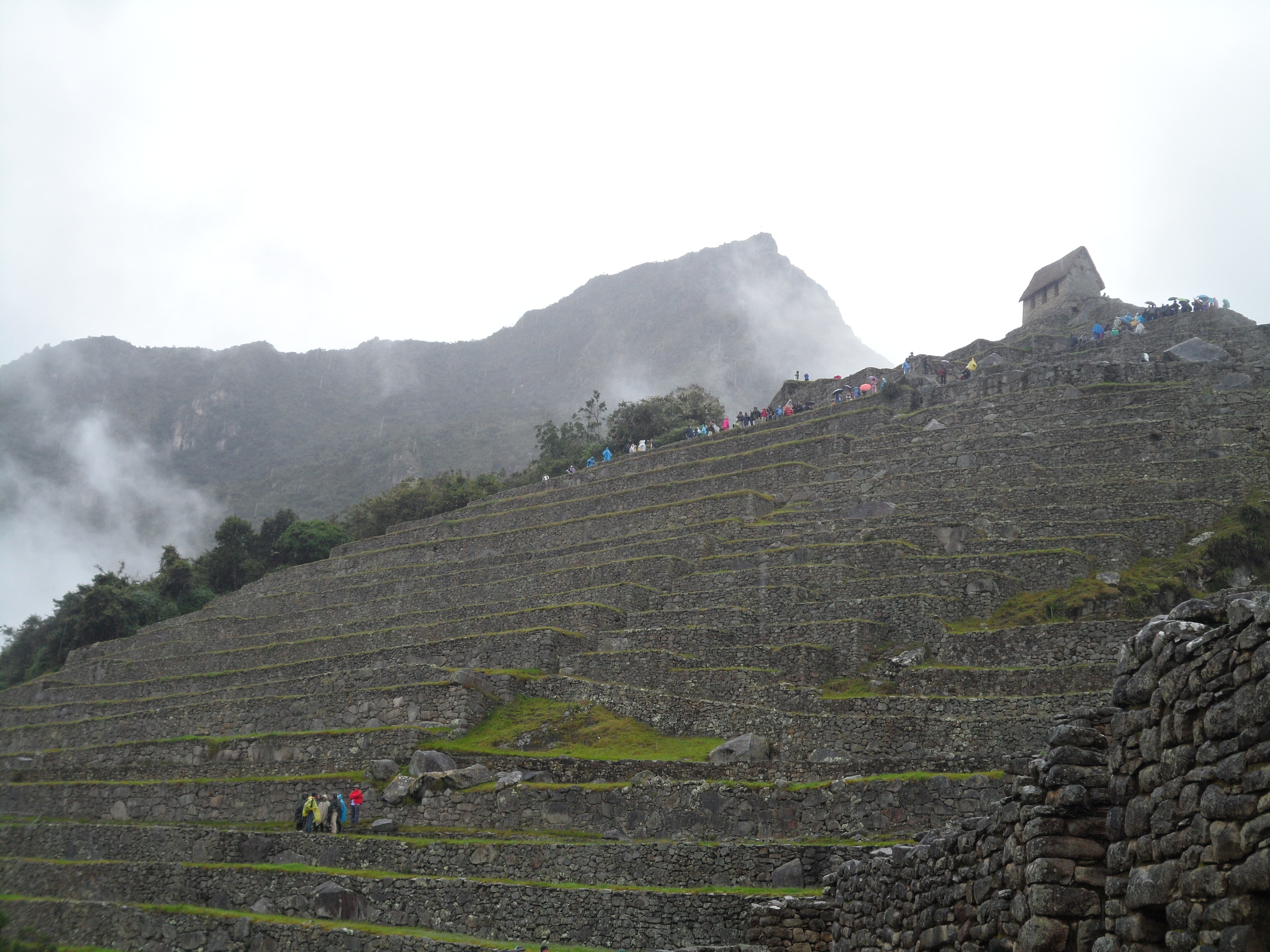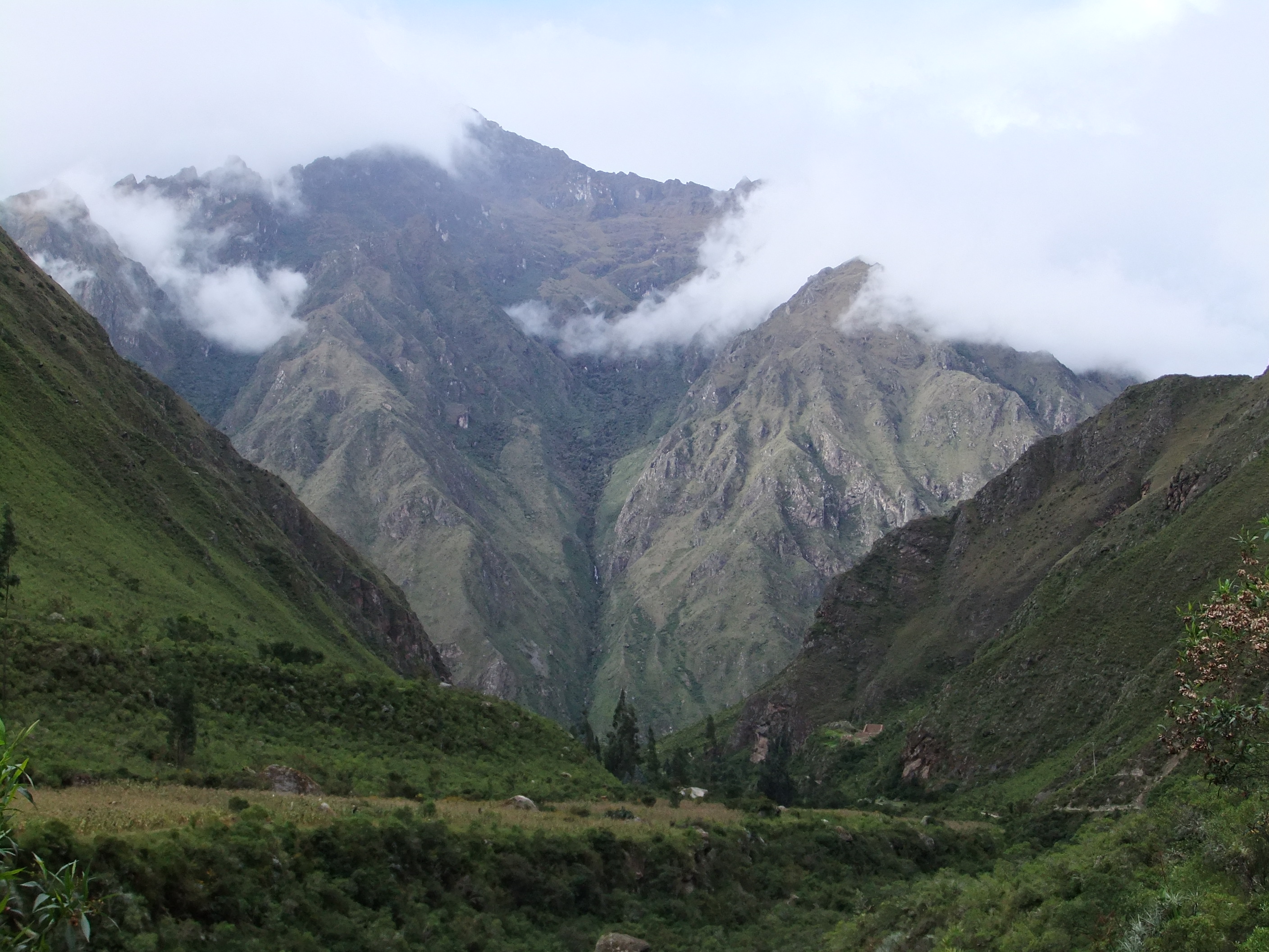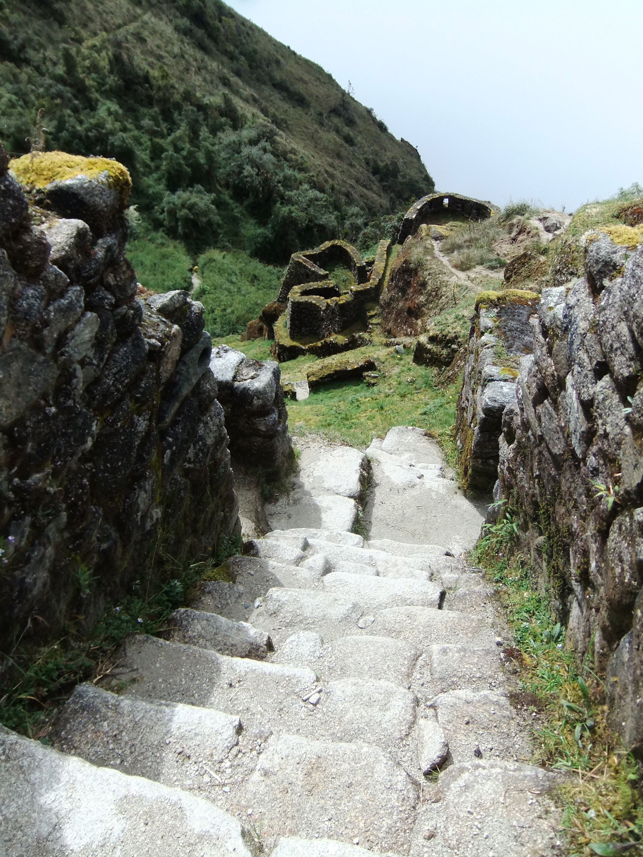 Today’s hike consisted of 11 hours of hiking, I did NOT want to waste time standing in the rain. I put on the alpaca gloves I bought in Arequipa, but every 10 minutes or so I had to wring them out they collected so much water. Then we went downhill. Each step was agonizing. I couldn’t go fast, because the steps were so uneven, but if I went slowly, I thought my legs would buckle under. I walked for 40 minutes without seeing another soul (apart from the passing porters). I was only a couple people from the front of the group, but everyone went at their own pace, so we rarely caught up to each other. The rain was not helping. If the sun had been shining, it may have been pleasant, but there was no view, no warmth, no end in sight. Just fog, and stairs and aching muscles… Why did I do this trek? We stopped at another Incan ruin but I hardly listened to the explanation because I was trying to keep warm, and not let my quads cool down. Every time we stopped, my muscles cooled and I had to start all over again. As we walked downhill on uneven rocks I began to curse whoever designed this stupid trail. Why did it have to be so uneven?!