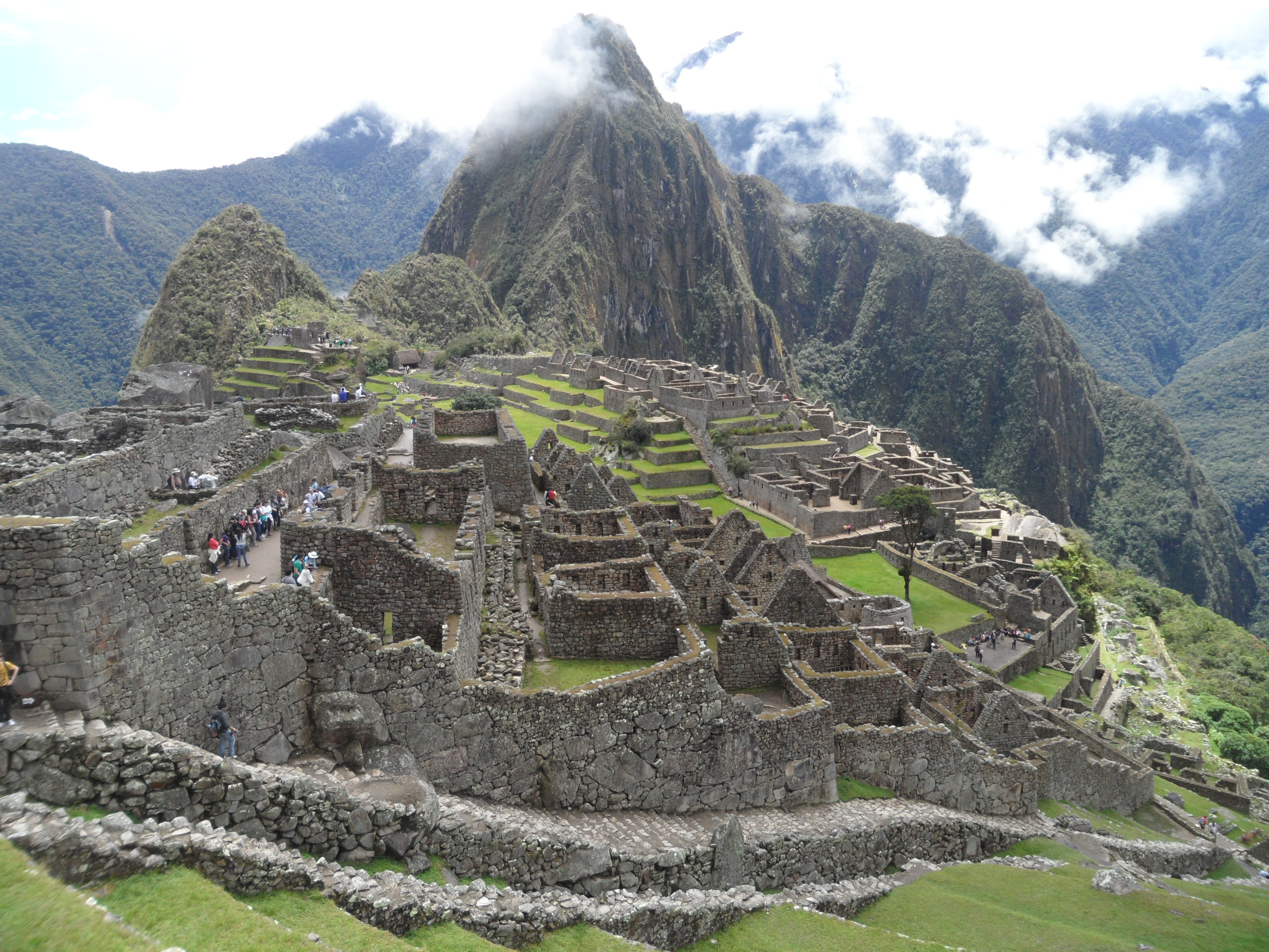 Machu Picchu itself is built on a steep mountain. The backside of the city drops off into a dangerously vertical cliff, and it is believed that many people were killed during this part of the construction. Gorgeous terraces spread upwards along the side of the city, and at one point were used for crops and gardens. The structures of Machu Picchu now are only stone walls, but when the city was in use, each of the buildings had dried, straw thatched roofs, smeared with llama fat in order to make them water proof. They say that when the sun shone down on the city, it lit up like gold with the beautiful, light tan structures. When you picture this, the entire city is even more surreal than before.